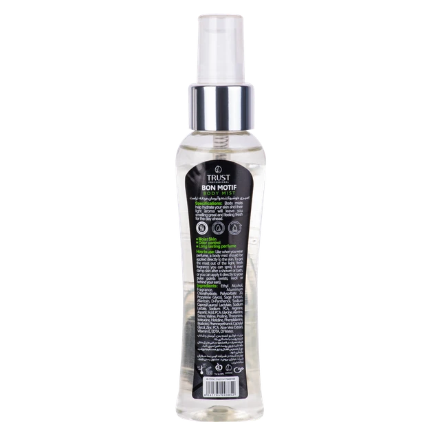 بادی میست مردانه تراست نوع رایحه: میوهای و خنک نت اولیه: آناناس، انگور سیاه، سیب سبز نت میانی: چوب، نعناهندی، یاس مراکشی، رز نت پایانی: مشک، خزه، وانیل: نوع رایحه میوهای و خنک