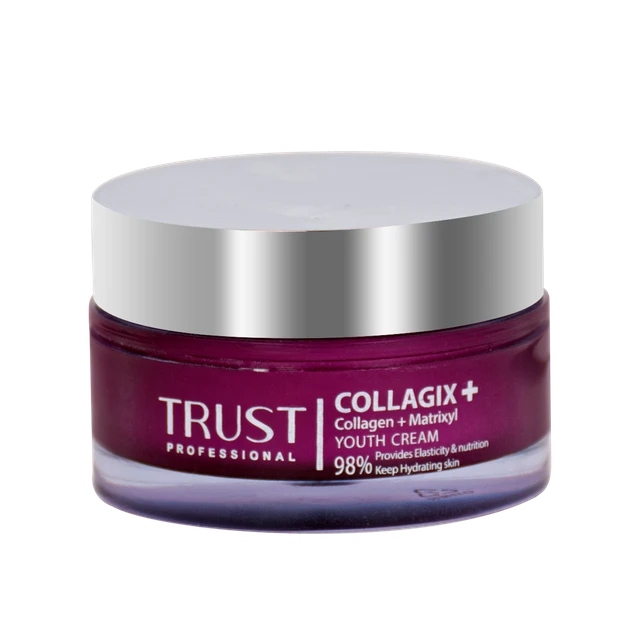 کرم جوانساز کلاژن تراست مغذی، تقویتکننده استحکام پوست و محرک ساخت کلاژن و الاستین بازسازیکننده سلولهای مرده پوستی و جلوگیری از ایجاد چینوچروکهای پوستی دارای خواص حفظ الاستیسیته و سفتکنندگی برای کمک به جوانسازی پوست